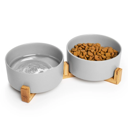 Miski dla zwierząt domowych zostały wykonane z wysokiej jakości ceramiki, co gwarantuje bezpieczeństwo dla zdrowia pupila. Możliwość mycia w zmywarce zapewnia codzienną wygodę, a naturalny stojak z bambusa stanowi ekologiczne i trwałe rozwiązanie. To praktyczny wybór zarówno do podawania suchej karmy, mokrej karmy, jak i wody.