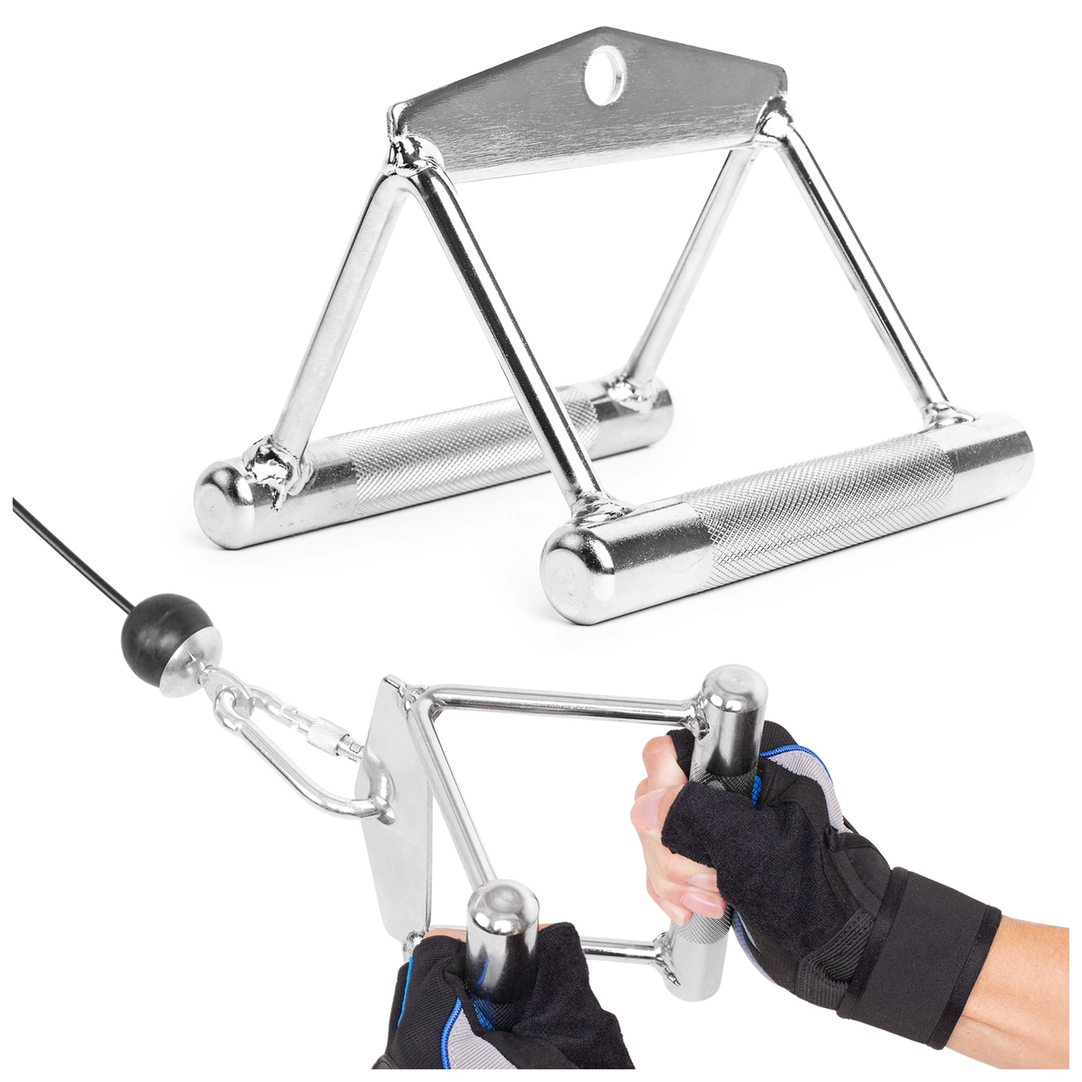 Podwójny uchwyt przeznaczony do treningu na wyciągu górnym i dolnym. Służy do ćwiczenia wielu grup mięśniowych. Korzystając podczas ćwiczeń z uchwytu rzeźbisz zarówno mięśnie ramion jak i barków, grzbietu czy klatki. Idealnie sprawdza się podczas ćwiczeń z połową sztangi ( druga połowa oparta o parkiet). Gryf idealnie wpasowuje się w środek uchwytu, umożliwiając swobodę wykonania ćwiczenia wiosłowania połową sztangi w opadzie tułowia.