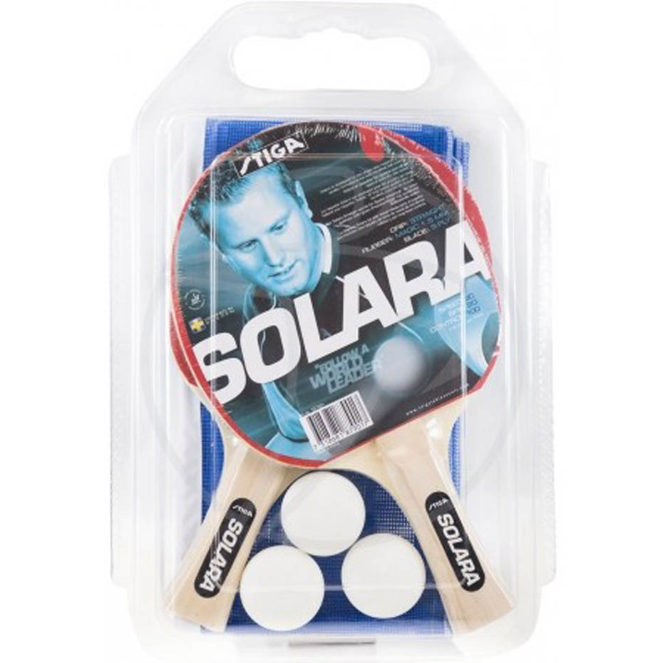 Zestaw do gry w ping ponga Stiga Solara przeznaczony jest do gry rekreacyjnej. Charakteryzuje się stosunkowo niewielką dynamiką i prędkością, ale bardzo dobrym czuciem i kontrolą. Zestaw zawiera: dwie rakietki, trzy piłeczki oraz siatkę.