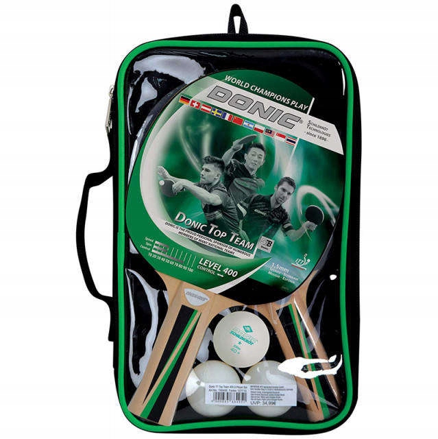 Zestaw do ping ponga marki Donic. Zestaw zawiera dwie rakietki z wklęsłymi rączkami, które są przeznaczone dla początkujących graczy. Trzy piłeczki treningowe w zestawie. Całość można zapakować w pokrowiec zapinany na zamek błyskawiczny.